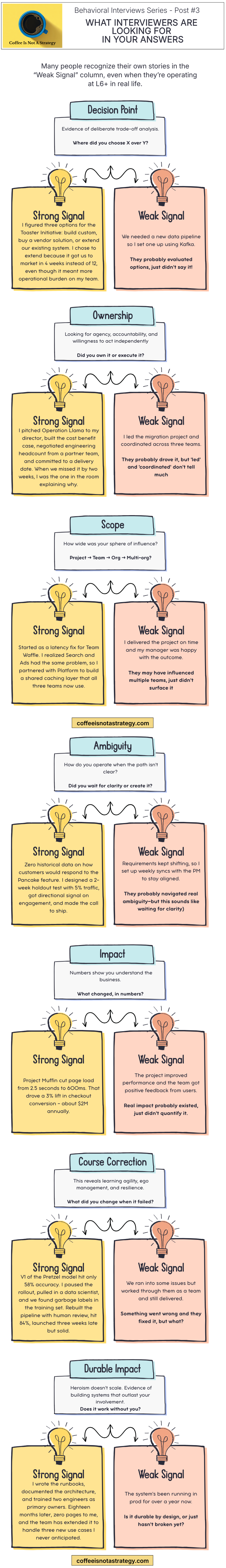 Hopefully this makes it clearer how interviewers are reading between the lines in your stories. Small shifts in what you surface can materially change how you get calibrated.